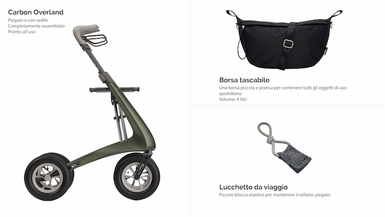 Rollator per tutti i terreni con pneumatici ultraresistenti e ottime sospensioni.
